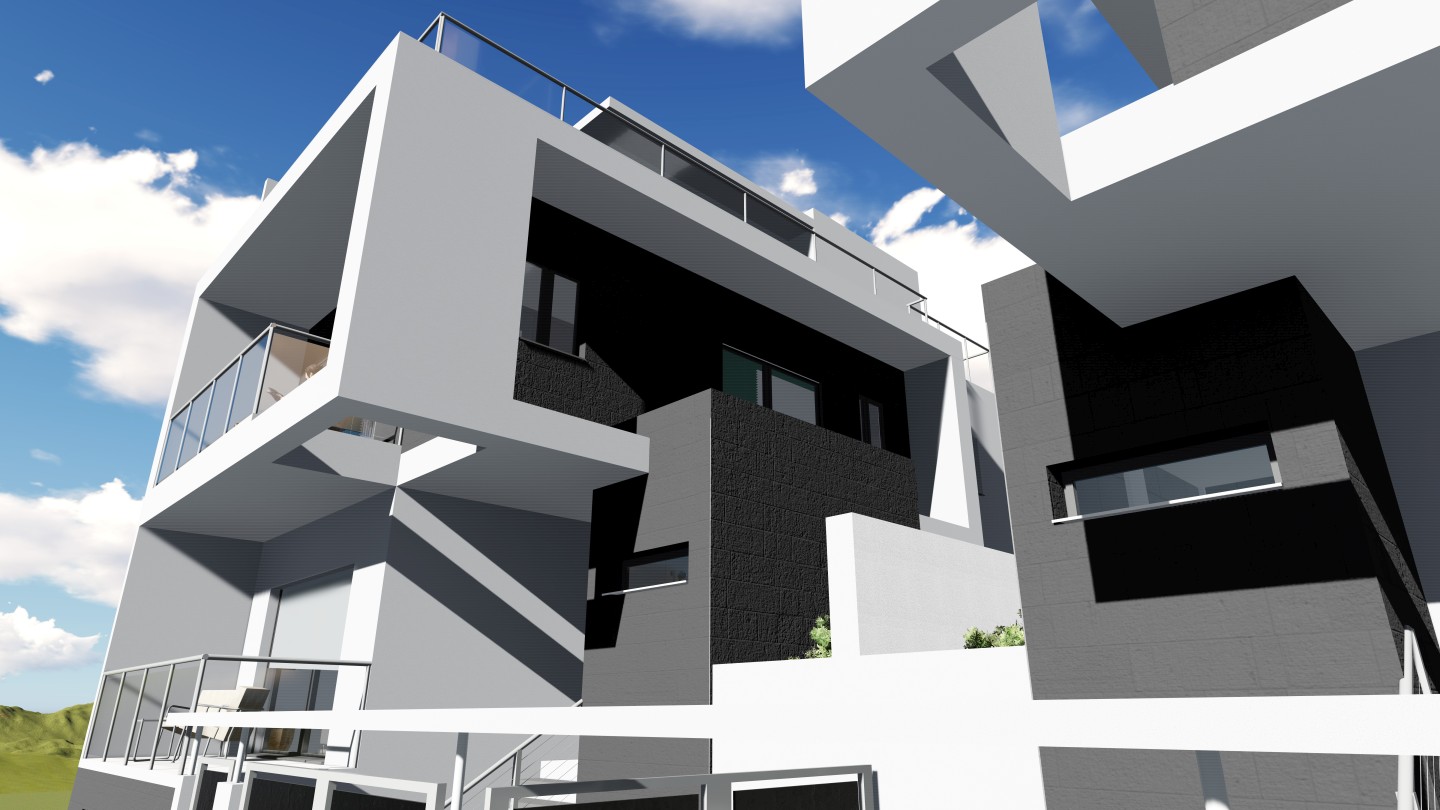 EXCLUSIVA FACHADA formada por Voladizos, huecos y viseras de hormigón visto que aportan