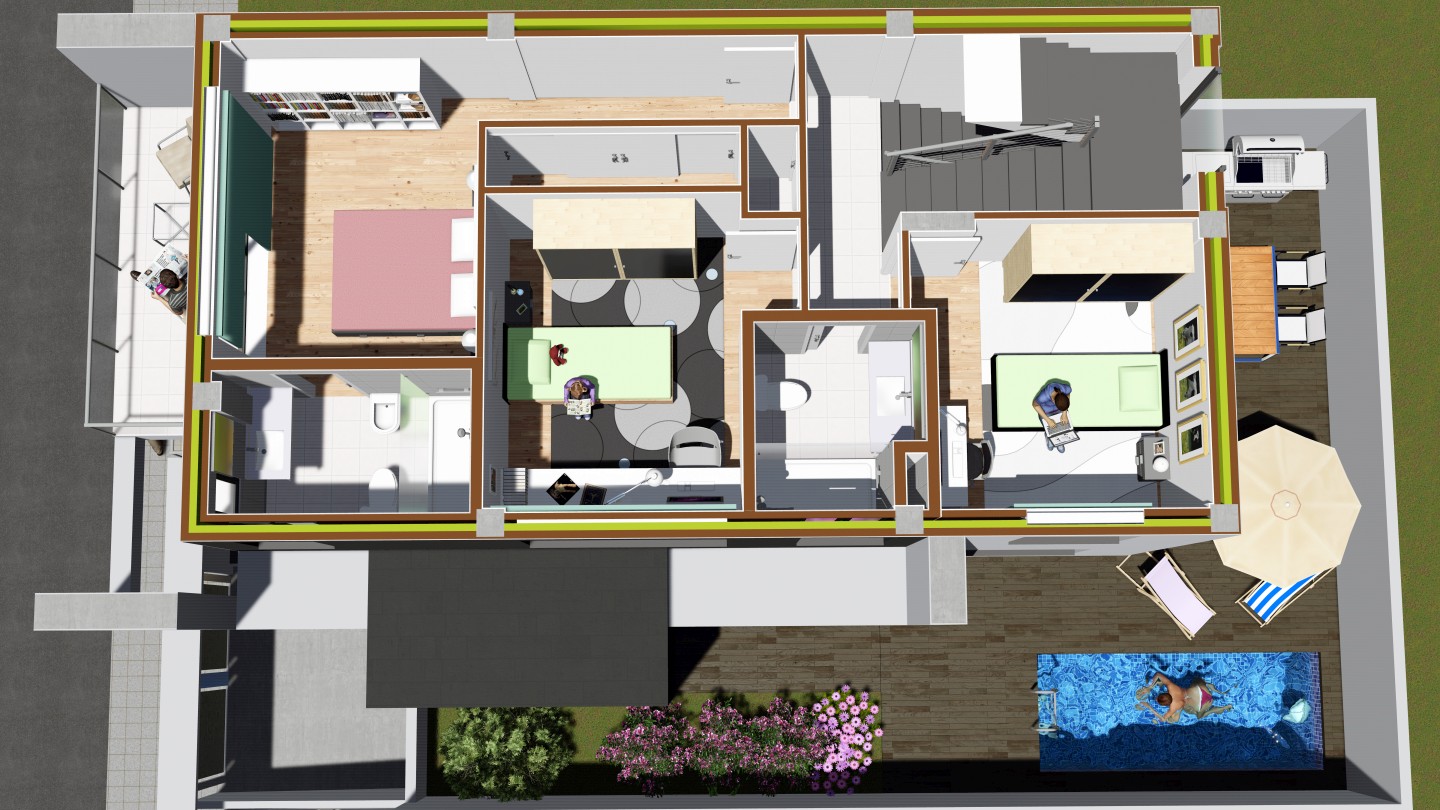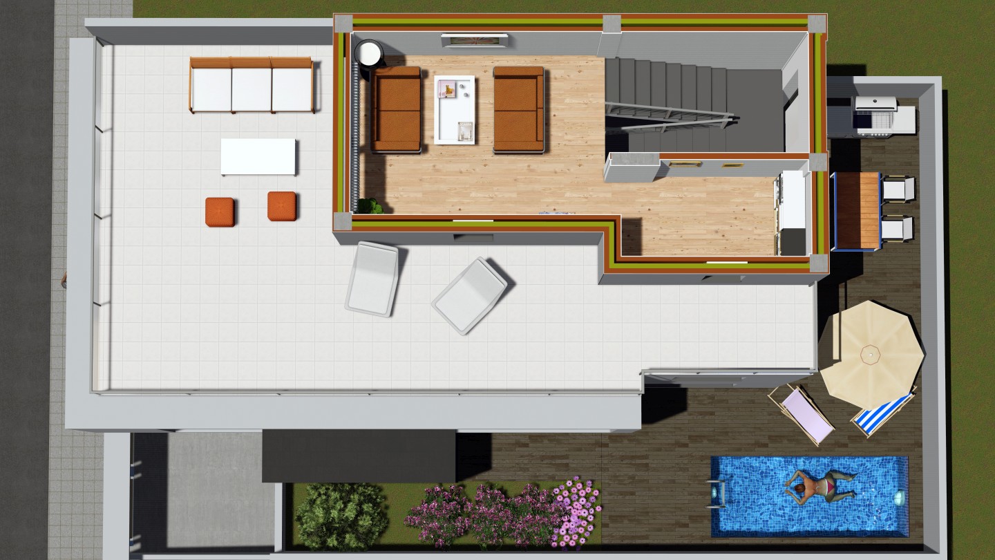El Zócalo que aporta gran diseño y protección a la Vivienda, así como gran sostenibilidad a su fachada ( autolimpieza y aislamiento) va cubierto con elementos a forma de dintel que aporta bastante diseño a la entrada principal.