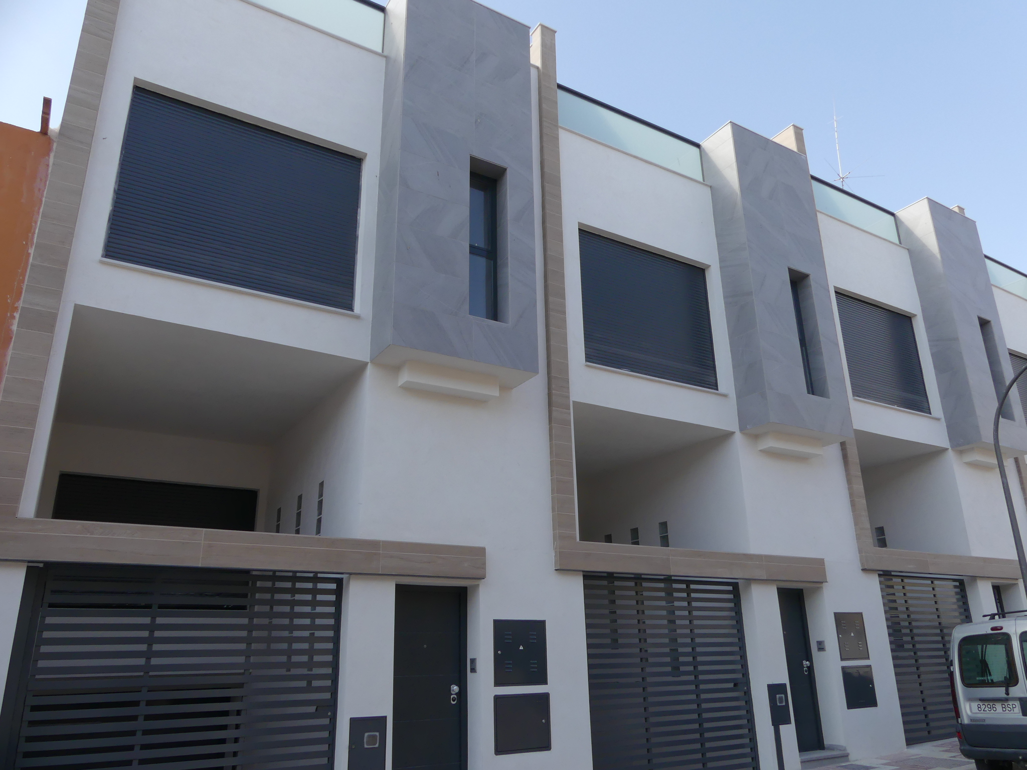 El Zócalo que aporta gran diseño y protección a la Vivienda, así como gran sostenibilidad a su fachada (autolimpieza y aislamiento) va cubierto con elementos a forma de dintel que aporta bastante diseño a la entrada principal.